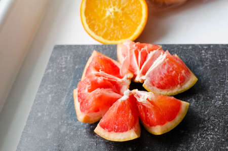 Sliced citrus fruit. Chopped fresh grapefruit on a black table.