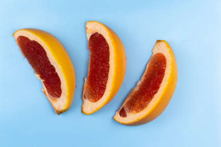 Three slices of grapefruit on a blue table close up