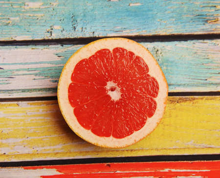 Half grapefruit on a colored wooden background, top view, close-up