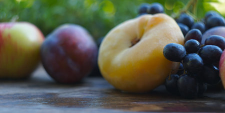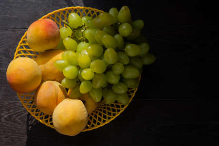 A bowl of tasty, ripe summer fruits on the brown wooden table. In the bowl peach, plum and white grapes. Top view, copy space