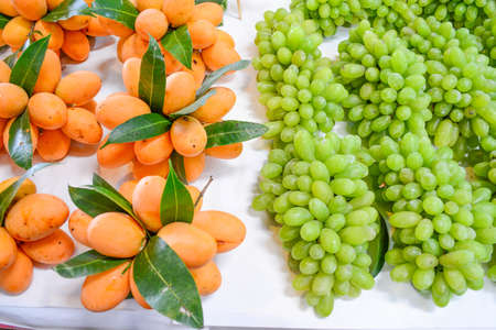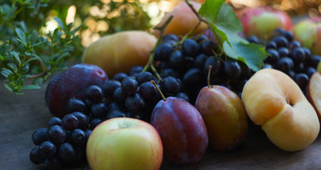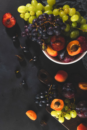 Freshly washed fruits with water droplets. bright high key look conveys freshness. Variety of fresh grapes, apricot and plumes on dark background. Fruit sources of vitamins