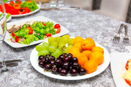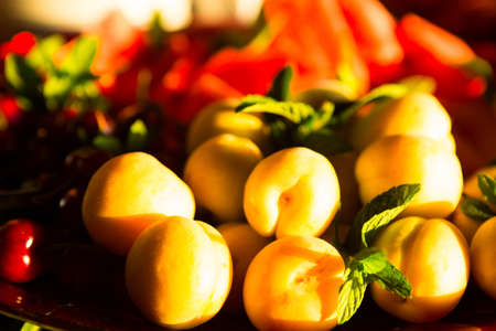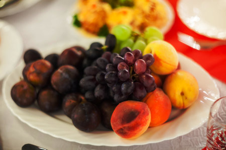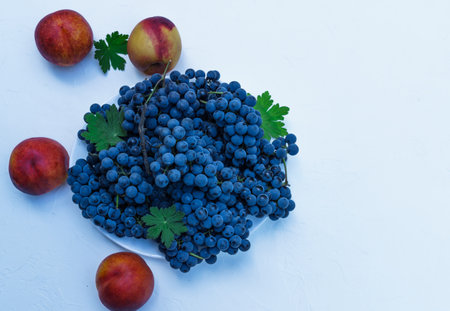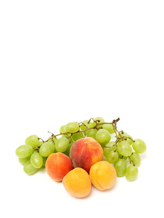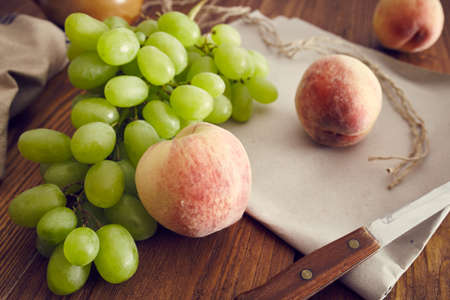 Peaches and grapes close-up. Macro photography of fruit in natural light. Ripe juicy peaches. Sweet delicious large grapes. Fruit for juice. Fresh tropical fruit on a plate.