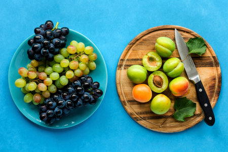 top view of fruits as basket of grape and peach with grape berries on blue background with copy space