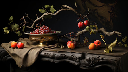 AI generated fruits in an ancient metal plate on the background of the oriental carpet