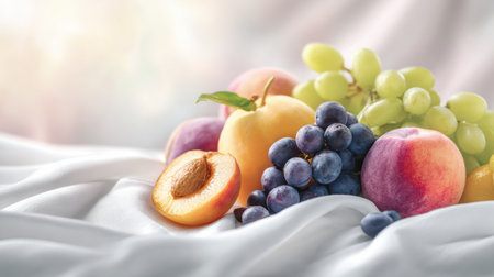 A vibrant arrangement of fresh fruits including plums, grapes, and apricots displayed on soft white fabric. Ideal for culinary themes and healthy lifestyle imagery.