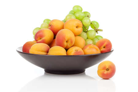 Fruits Still life with fruit on white ceramic bowl. Concrete wall. Dramatic light. Grapes, apricots and plums.