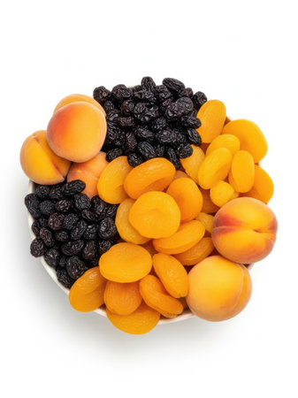 A colorful assortment of dried apricots and raisins arranged on a pristine white background, showcasing their natural textures and rich colors.