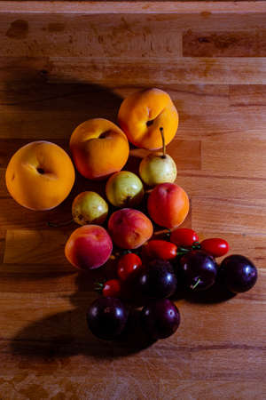 still life with fresh seasonal fruits on wooden table with melon, pears, tomatoes, peaches, plums, apricots and banana