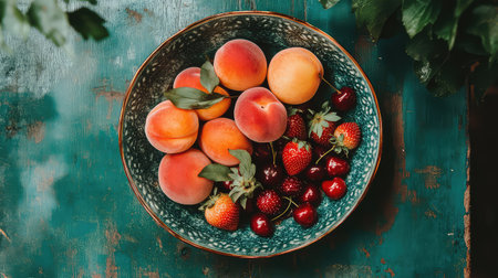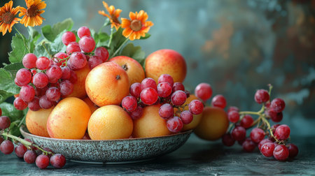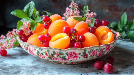 A beautiful still life featuring a vintage bowl filled with ripe apricots and cherries, accented by delicate flowers, showcasing seasonal freshness and color.