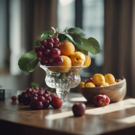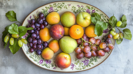 A beautiful display of fresh fruits, including apples, oranges, and grapes, on an elegant plate with green leaves, evoking a sense of health and abundance.