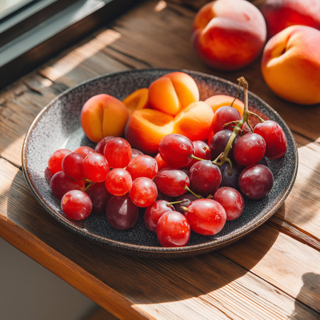 Fresh ripe plums and apricots in a ceramic bowl in a rustic kitchen setting