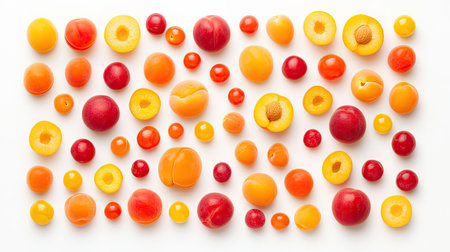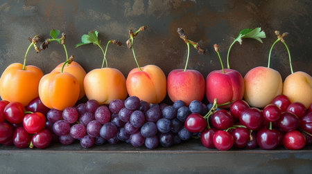 A minimalist display featuring freshly picked summer fruits such as cherries, grapes.