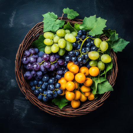 A basket filled with green purple and orange grapes along with fresh berries rests on a dark surface showcasing a vibrant fruit selection.