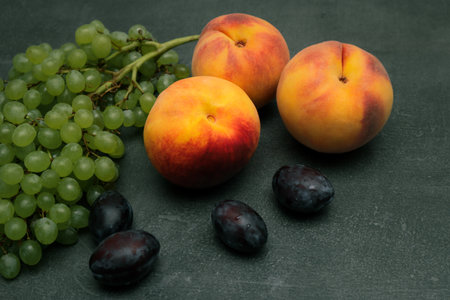 Plums, grapes, peaches. Still life with pears, grapes and plums. Variety of fresh fruits on black stone background.