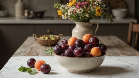Fresh plums and apricots in a ceramic bowl with leaves and flowers in a rustic kitchen setting
