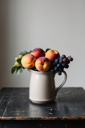 AI Generated. A pitcher filled with fruit sitting on top of a table