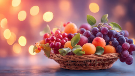 A stunning display of assorted fresh fruits arranged in a woven basket, creating a delightful visual with a colorful bokeh background, perfect for healthy themes.