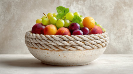 A beautiful composition of fresh fruits including grapes, plums, peaches, and apricots in a unique textured bowl, perfect for showcasing healthy eating and vibrant colors.