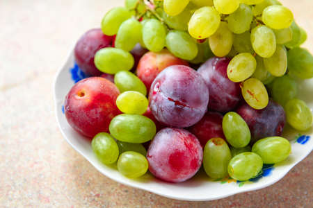 green grapes and plums in a plate on the windowsill, concept of fresh fruits and healthy food