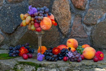 Still life of flowers and fruits, rich harvest, peaches and grapes