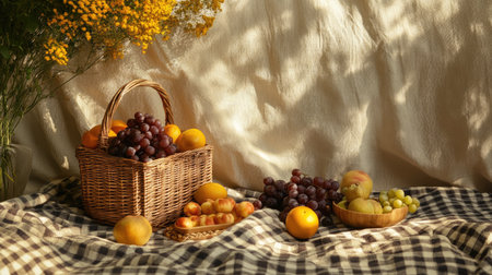 A charming arrangement of fresh fruits in a woven basket, accented by flowers. The scene captures warmth and vibrancy, showcasing nature's bounty.