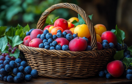 A vibrant basket filled with fresh blueberries, plums, peaches, and yellow fruits on display