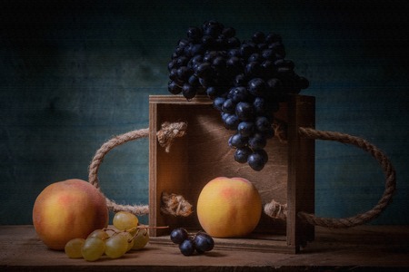 Natural still life with grapes in vintage tin vase. Interior decoration - photo print large format.