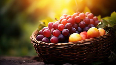 A visually appealing arrangement of fresh fruits including grapes and melons in a woven basket, enhanced by gentle sunlight and soft shadows for a serene ambiance.