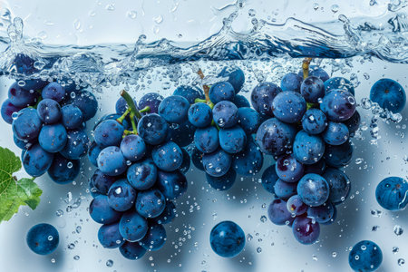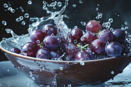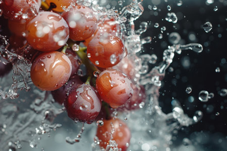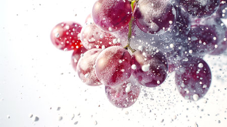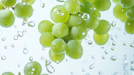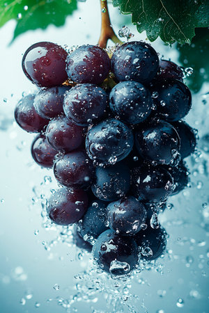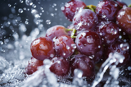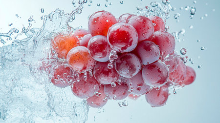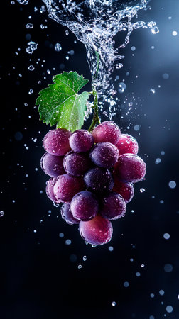 A cluster of grapes being surrounded by splashing water, creating a refreshing and rejuvenating scene.