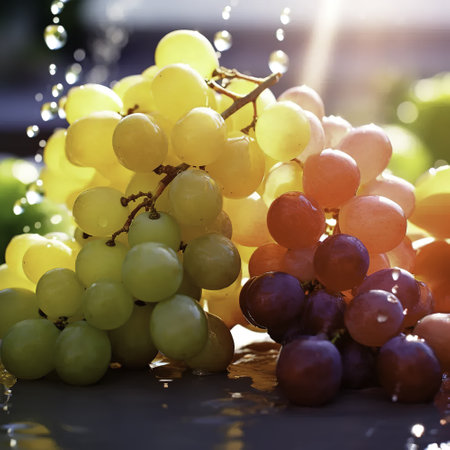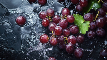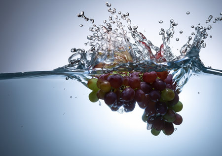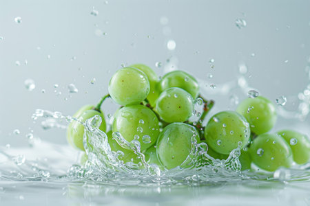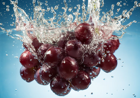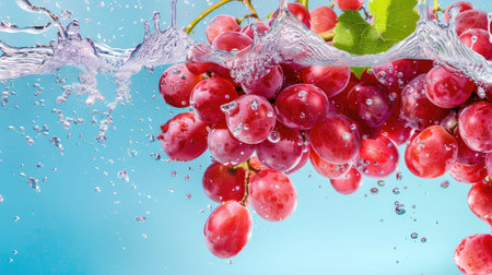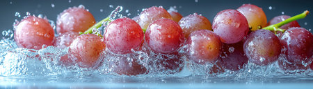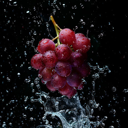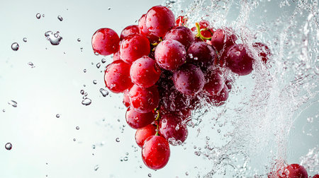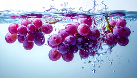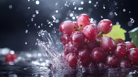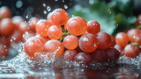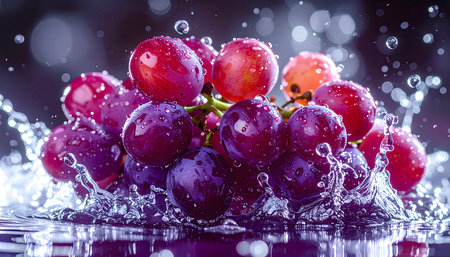 Dive into freshness with this stunning image of grapes caught in a splash of water, showing vibrant colors and dynamic movement, perfect for any project