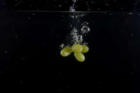 Grapes falling into water with splash and bubbles on black background