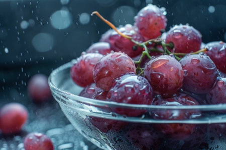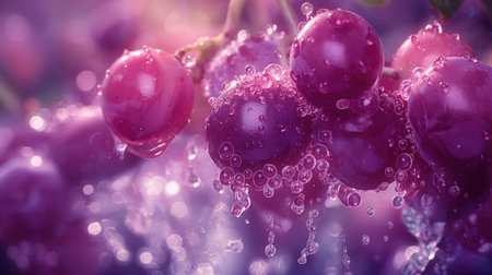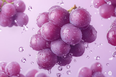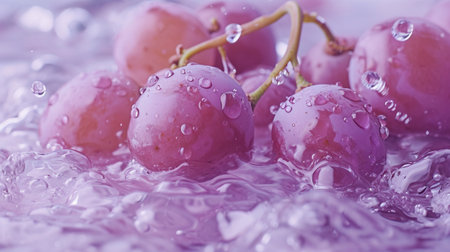 Ripe red grapes with water droplets creating a refreshing visual on a purple background
