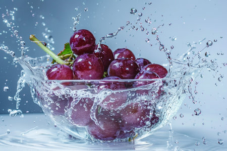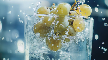 A close-up of grapes splashing into a glass of water, capturing the freshness and juiciness, perfect for a refreshing summer drink.