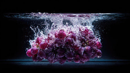 A stunning visual of fresh grapes splashing into water, capturing the essence of freshness and vitality. Perfect for food, health, and nature themes.