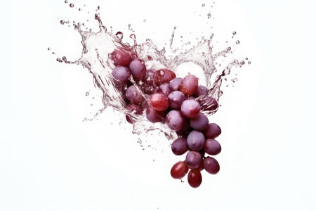 Fresh grapes and splashes of water on a white background. AI generative. Healthy life, diet, fresh food, healthy eating.