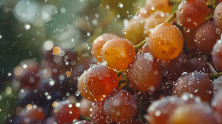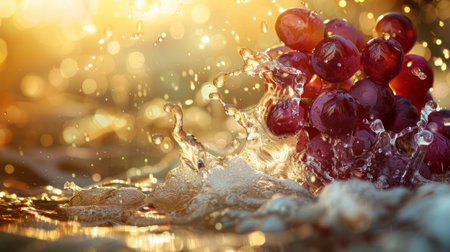 A dynamic close-up of grapes splashing in water with a golden bokeh background, capturing motion and freshness. Highlights themes of fruit, vitality, and energy.