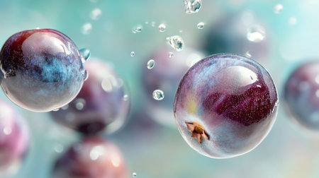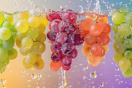 A colorful backdrop has grape chunks floating in the air. water drops splash. AI Generated