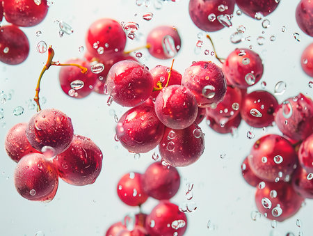 Red bunches of grapes hang in the air in drops of water on a white background. A delicious snack. The image is created in a playful and carefree mood, as if the grapes are having fun and enjoying what falls from the tree