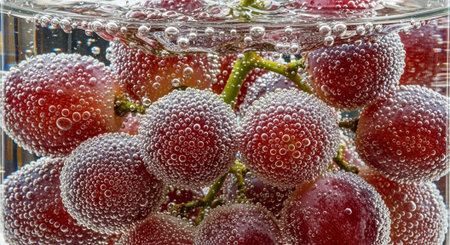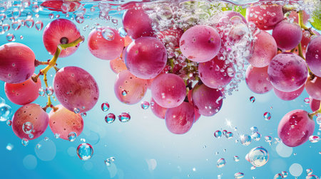 A stunning image of fresh grapes submerged in water, showcasing vibrant colors and bubbles, perfect for emphasizing freshness and health.