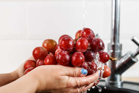 the girl washes a bunch of red grapes in her hands. Closeup