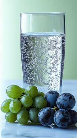 Crisp sparkling water accompanies fresh green and black grapes on smooth marble.
