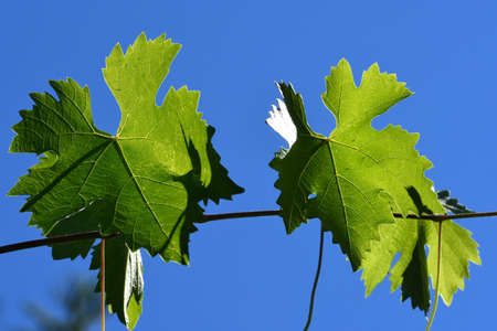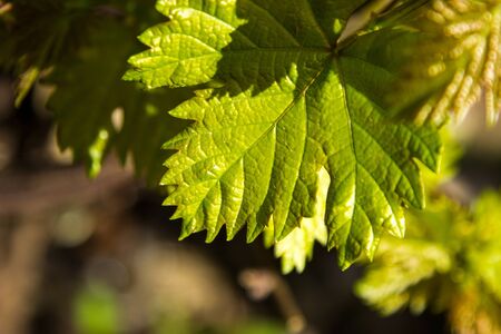 Grape leaves illuminated by the rays of the bright summer sun close-up. The structure of the grape leaf to the light. Original unique picture shot in bright sun