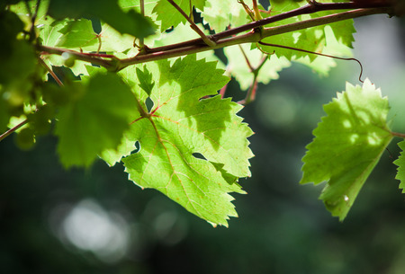 Green leaves grape on abstract summer blurred background with sun and bokeh