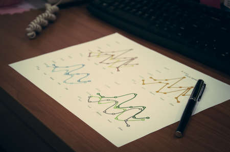 Line graph on desk and pen. Vintage filter
