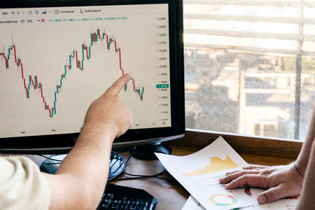 A stock investor shows another investor the behavior of a stock on the stock market on the monitor. Concept economy, stock market.