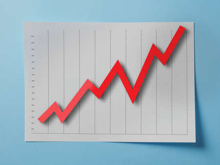 Red growth arrow on blue background. Arrow graph going up. The economic growth