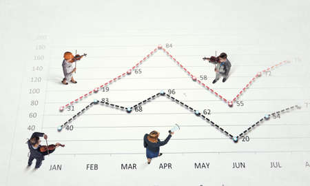 Businessmen miniature figure standing on investment and profit graph for analysis and discussion.