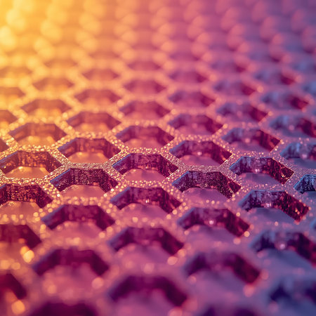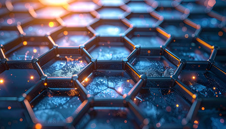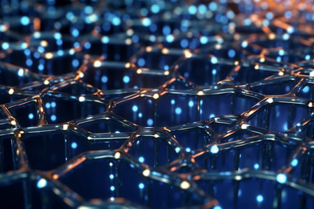 A close-up of a hexagonal network structure with glowing orange edges and blue-tinted glass-like cells.