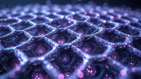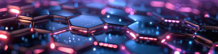 This stunning abstract illustration portrays molecular structures combined with hexagonal patterns and rich purple tones, creating a futuristic digital atmosphere.