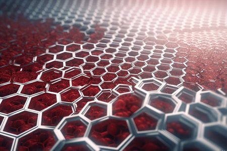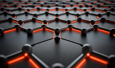 This striking abstract image features a close-up view of a hexagonal grid illuminated by glowing red nodes, evoking a futuristic and scientific atmosphere.